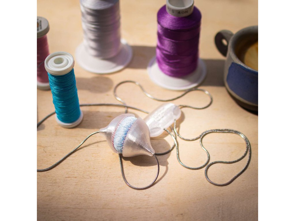 Náhrdelník Popuk zachycuje prchavý moment počátku – myšlenku, která se dere z nitra na povrch, nebo pukající jádro nového života. Tento výrazný solitér vznikl jako experimentální zkoumání hranic mezi 3D tiskem a strojní výšivkou. Ač se tyto technologie zdají vzdálené, spojuje je princip vrstvení polymerního vlákna, který Popuk uchopuje v unikátním prostorovém celku.
