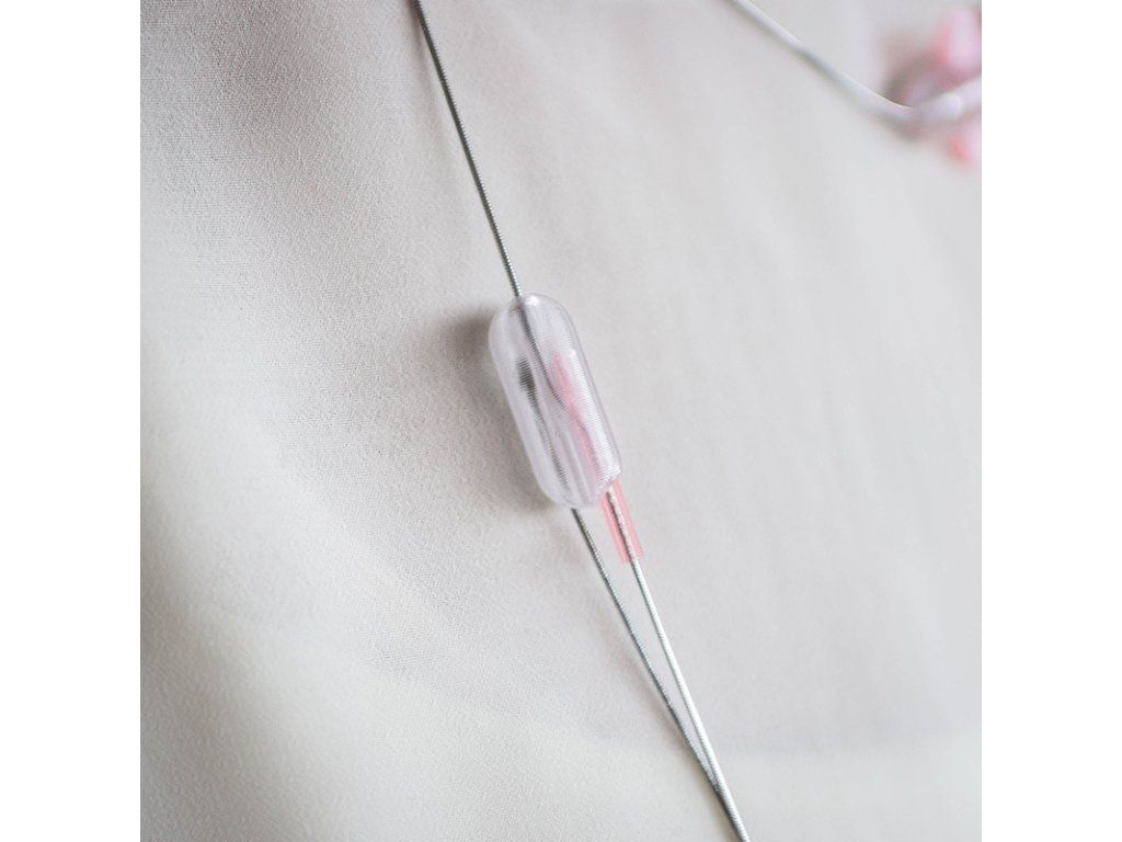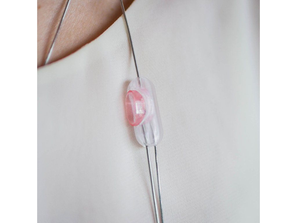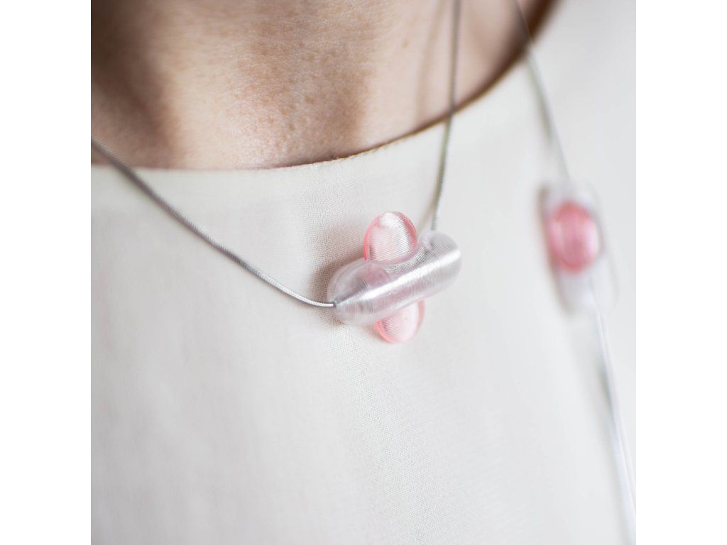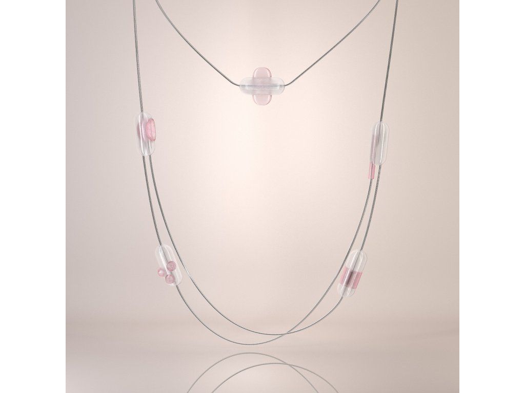 Jemný (kratší) náhrdelník: Skládá se ze dvou 3D tištěných dílků na koncích hadovitého řetízku z chirurgické oceli o délce přibližně 43 cm. Propojením dílků vzniká přívěsek, který spolehlivě slouží jako zapínání.Výrazný (delší) náhrdelník: Tvoří jej čtyři 3D tištěné elementy na hadovitém řetízku z chirurgické oceli o délce 123 cm. Díly po řetízku hladce kloužou a lze je libovolně rozmístit.